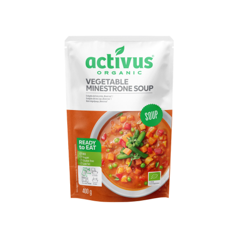 Activus bio vegán zöldséges minestrone leves 400 g Fogyasztásra kész étel - csak melegíteni szükséges! Víz, bio zöldségek* (sárgarépa, fejeskáposzta, burgonya, zöldbab, zöldborsó, édes paprika) 36%, bio paradicsompüré*, bio repceolaj*, bio fűszerek*, b