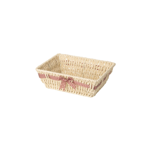 Téglalap alakú fonott kosár kockás szalaggal és masnival. Természetes anyagból készült, fém vázzal. Méretek: hosszúság: 260 mm, szélesség: 200 mm. Ideális minden háztartásba.
