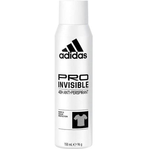 Izzadásgátló - női, spray, normál és száraz bőrre ajánlott, frissítő illat, védő, hosszantartó hatás, nem hagy foltot, vegán, alkoholmentes, 150 ml-es kiszerelés Az ADIDAS Women Pro Invisible 150 ml-es izzadásgátló megbízható, 48 órás védelmet nyújt az izzadás és a kellemetlen szagok ellen. Innovatív ruhavédelmi rendszere megakadályozza a fehér foltok kialakul