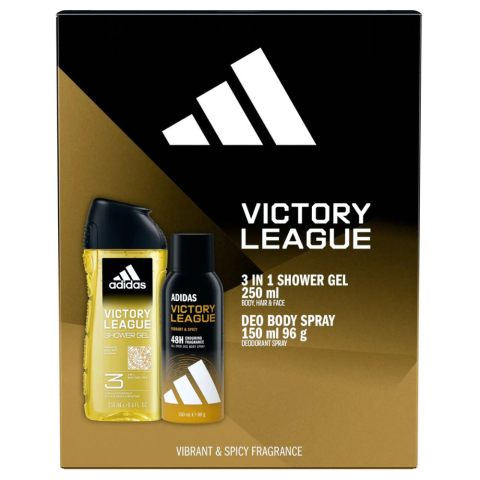 Az Adidas Victory League ajándékcsomag tökéletes választás a céltudatos férfiak számára. A szett egy 3 az 1-ben tusfürdőt és egy dezodor spray-t tartalmaz, melyek a győzelem energikus, fás-orientális illatával frissítenek fel. Az Adidas Victory League