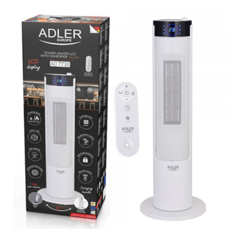 AD7730 légfűtő hatékony kerámia fűtővel, LCD kijelzővel, párásító funkcióval, ventilátorral és távirányítóval. A beépített termosztát automatikusan fenntartja a kívánt hőmérsékletet a helyiségben, szükség szerint be- és kikapcsolja a készüléket. A készülék időzítővel rendelkezik, amely lehetővé teszi a munkaidő 1 és 12 óra közötti beállítását. Az LCD kijelző a kiválasztott hőmérsékletet 10-35°C tartományban mutatja. A készülék 1400W va