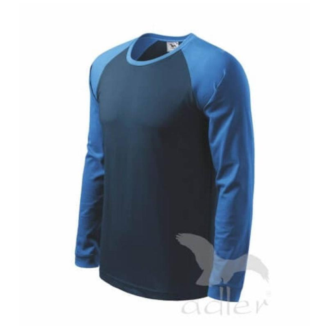 Magas grammsúlyú jó minőségi férfi póló hosszú ujjú raglán ujjakkal. Divatos keskeny csík a nyakrészben, az ujjak a színes variánsban kontraszt színben.