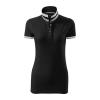 Pique, 100 % pamut szűkített szabás oldalvarrással1:1 bordás kötésű gallérral és ujjvégekkela felhajtható gallér alsó felülete és az ujjak szegélye kontraszt színű csíkokkalkeskeny gombolópánt 4 gombbal a szövet színébenaz oldalvarrásokban és az alsó n