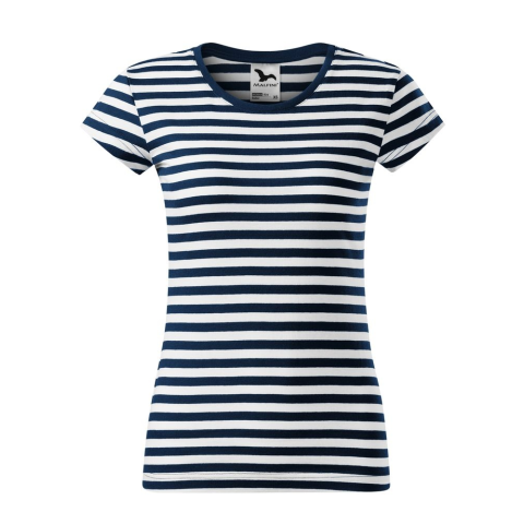 Single Jersey, 100% pamut fehér és sötétkék csíkok, íves szabású, oldalvarrással, mélyebb, kerek nyakkivágás, 1:1 bordás kötésű keskeny nyakszegély 5 % elasztánnal, hátsó nyakszegély belső oldala különböző anyagból, megerősített vállpánt, rövidített uj
