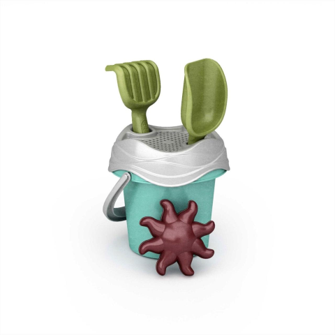 Vödör a homokkal és a vízzel való játékhoz.Teljes készlet 5 darabból áll: vödör, lapát, gereblye, szita és homokozóforma.Vödör átmérője: 13 cm.