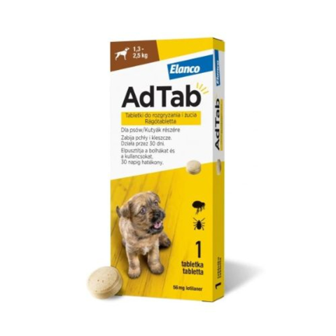 Az AdTab Rágótabletta egy hatékony és könnyen beadható rágótabletta, amely kutyusoknak nyújt védelmet bolhák és kullancsok ellen. Hatóanyaga a lotilaner, amely a kullancsok és bolhák idegreceptoraira hat, így védelmet nyújt és hatékony kezelést kínál az egész hónap során. Rövid időn belül elpusztítja a bolhákat és kullancsokat, miután azok a kutyust megharapták és érintkezésbe kerültek a hatóanyaggal.