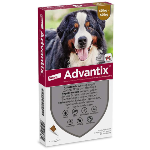 Advantix Spot On rácsepegtető oldat kullancs, szúnyog, bolha ellen kutyák számára Az Advantix Spot On 40–60 kg egy kutyák számára kifejlesztett, hatékony repellens oldat, amely védelmet nyújt a kullancsok, bolhák, szúnyogok és szuronyos istállólegyek elle