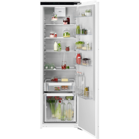 Beépíthető hűtő - fagyasztó nélküli, energiaosztály E, hűtőtér tárolókapacitása 310 l, jobb oldali zsanéros, 5 polc, 1 hűtőkör, LED világítás, méretek 176,9 × 55,7 × 54,9 cm (Ma×Sz×Mé), az első díszítőpanel az ajtón nem a kiszerelés része Ez a beépíthető AEG hűtőszekrény kizárólag a hagyományos hűtőszekrények klasszikus funkcióit látja el, nem tartalmaz fagyasztót, ezért lényegesen gazdaságosabb, mint a hagyományos modellek. Jobb oldal