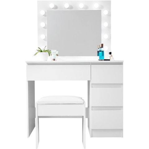 AGA öltözőasztal MRDT09 tükörrel és világítással + zsámoly, matt fehér bútor termékleírás