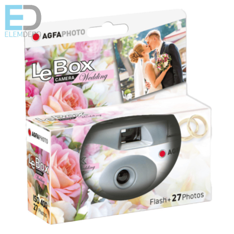 Agfa LeBox Wedding Eldobható fényképezőgép sikeres esküvőkhöz. A LeBox Wedding eldobható fényképezőgéppel könnyedén készíthet 27 színes fényképet, miközben megőrzi a film varázsát és szórakozását. A 31 mm-es objektív és a 400 ISO-érzékeny beépített fil