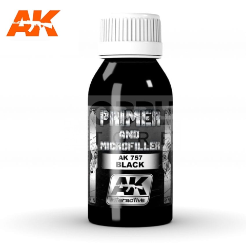 AK-Interactive BLACK PRIMER AND MICROFILLER alapozófesték 100 ml AK757 Ultrafinom kiváló minőségű szintetikus alapozófesték airbrush használathoz. Használat után a szórópisztoly és a szerszámok tisztítását AK Extreme Cleanerrel javasolt elvégezni. Az AK