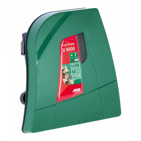 AKO Duo Power X 4000 villanypásztor készülék: Sokoldalú, 230V/12V-os rendszer 4,5 J tárolt energiával. Ideális hosszú kerítésekhez, sűrű növényzethez és vaddisznó-elhárításra. Német minőség, 3 év garanciával. AKO Duo Power X 4000: Csúcskategóriás villa