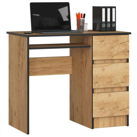 A-6 Craft Tölgy Íróasztal: Praktikus és Stílusos Munkahely 💻 Ez a 90 cm széles A-6 íróasztal tökéletes választás otthoni dolgozóhelyként vagy diákok számára. Craft tölgy színével kellemes és modern megjelenést kölcsönöz a szobának. A 3 praktikus fi...