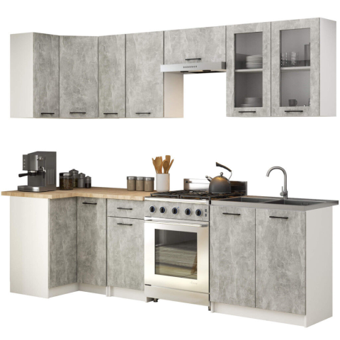 1 kép Akord Oliwia 3M Sarok Konyhabútor Szett Vitrines Szekrénnyel Beton/Fehér