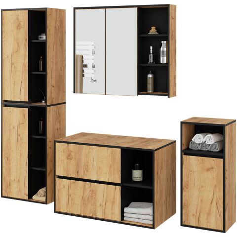 AKORD VAMI Craft Tölgy/Fekete Fürdőszobabútor Szett - Modern elegancia a fürdőszobádba! 🛁 Varázsolja fürdőszobáját stílusos és praktikus térré az AKORD VAMI fürdőszobabútor szettel! Ez a modern, falra szerelhető szett tökéletes megoldás a tárolási ig...