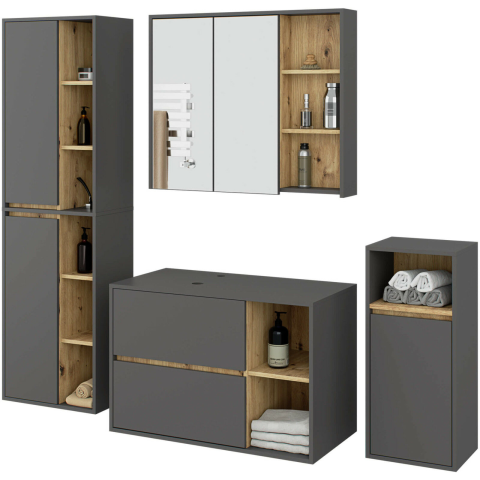 AKORD VAMI Grafit Szürke/Artisan Tölgy Fürdőszobabútor Szett - Modern elegancia és praktikus tárolás 🛁 Ez a stílusos fürdőszobabútor szett tökéletes választás a modern otthonokba, ötvözve a grafit szürke és artisan tölgy színek elegáns kontrasztját a...