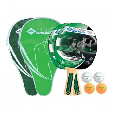 A Donic Champs 400 Cover szabadidős asztalitenisz szett nagyszerű kikapcsolódást nyújt két játékos számára. A pingpongütők ergonomikus fogói fából készültek, az ütőfelület borítása 1,5 mm vastagságú szivacs és jade gumi. Az ütők védelmét a cipzáras ütőto