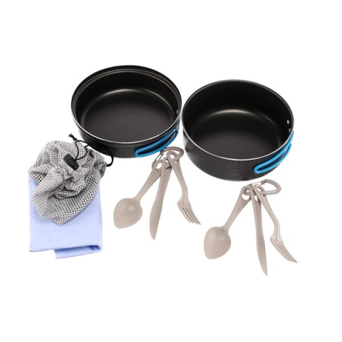 Kemping edény - anyaga teflon, 6 darabos készlet, készlet tartalma edény, evőeszköz és csajka, A cseh VAR márkájú, tapadásmentes, kétrészes kemping készlet egy 1,7 literes edényt és egy 0,85 literes, serpenyőként is használható fedőt tartalmaz. Az edények kiváló minőségű alumíniumból készülte