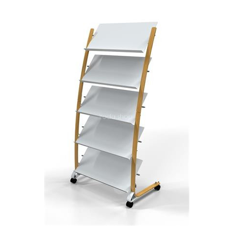 Katalógustartó, mobil, 5x3 rekeszes, ALBA, fa/fehér Letisztult dizájn fa és acél anyagok kombinációjával, könnyen látható tartalom. - fém állvány műanyag polcokkal - FSC tanúsítvánnyal rendelkező faanyagból készült - mobil állvány 4 kerékkel (2 bl