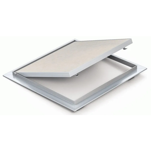 Alumínium keretes revíziós ajtó, gipszkarton betéttel, rugós zárral. Az ajtó nyomásra nyílik - csukódik.