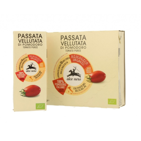 BIO paradicsompüré 3x200g kiszerelésben.Vellutata (krémes) állagú. Az Alce Nero bio krémes paradicsompüré hosszúkás paradicsomból készül, amit mintegy 30 gazdaságban termesztenek a Po Deltában Ferrara és Ravenna tartományban. Az Alce Nero krémes paradi