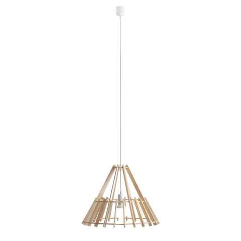 Fából készült függesztett lámpa, amely szokatlan kialakításával vonzza a tekintetet. A lámpa oldalsó, fa elemei érdekesen szórják szét a fényt. Remek választás a természetes anyagok kedvelőinek, akik mindenekelőtt a melegséget, a békét és a harmóniát érté..