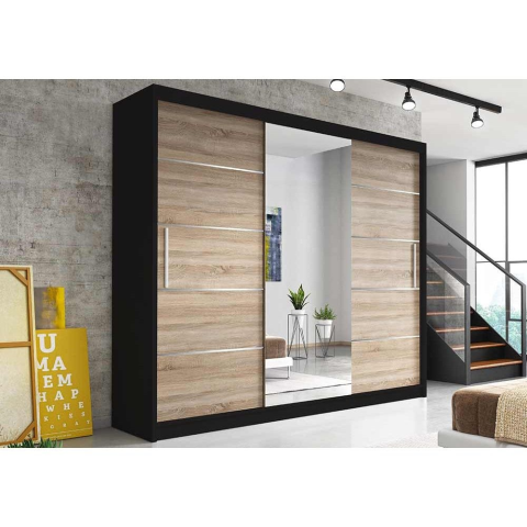 Alfaomega Firenze250 tolóajtós, tükrös, gardróbszekrény fekete-tölgy bútor termékleírás
