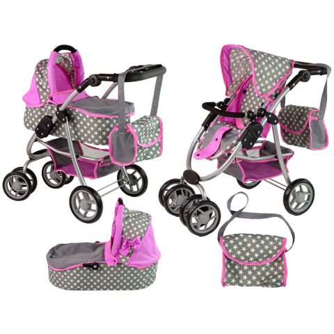 Baby Doll babakocsi 2 az 1-ben mózeskosár rózsaszín csillagokkal Baby Doll babakocsi 2 az 1-ben mózeskosár Rózsaszín Csillagok Ez a babakocsi ideális játék azoknak a lányoknak, akik vigyázni szeretnének a babáikra. A divatos színek és grafikák játé...