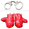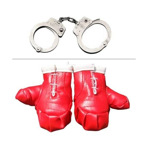 Ötletes autó beltéri dekoráció. Az egyik tárgy egy fémből készült bilincs a másik egy boxkesztyűt ábrázol. Tükörre helyezhető, így akár egy életérzést is tud képviselni az autóban.