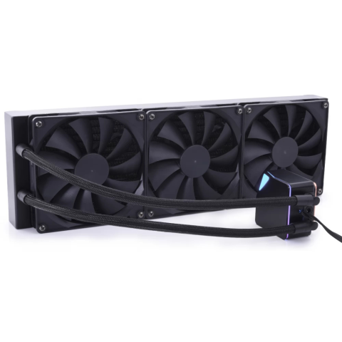Kompakt, univerzális vízhűtés 3 darab 140mm-es PWM szabályzású ventilátorral és vezérelhető ARGB világítású CPU hűtőblokkal.