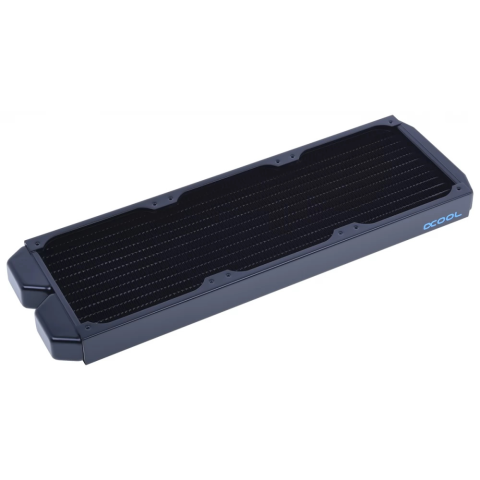 Vízhűtő radiátor. Tulajdonságok: - Belső anyag: főleg réz - Borítás anyaga: oldalsó panel: acél, menet: sárgaréz, kamra: réz - Szín: fekete - Méret: 400mm x 124mm x 30mm - Vastagság: 30mm - Borda...