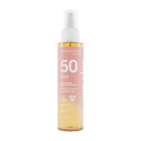 Erősen védő fényvédő olaj SPF 50 új generációs vízálló formulával, bio kókuszolajjal, bio jojobával és bio málnával dúsítva.