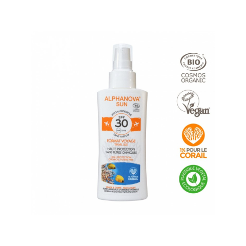 Az SPF 30 utazási fényvédő természetes és BIO és VEGÁN minősítésű. Parabének, tartósítószerek, cink-oxid és parfüm nélkül .