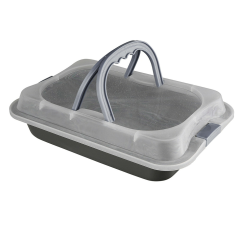 A fedő megvéd a rovaroktól, akkor is jól jön, ha piknikre vagy partira kell szállítani a süteményt. A praktikus fogantyúk megkönnyítik a tepsi szállítását, a stabil re