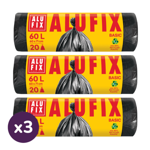 Alufix Szemeteszsák normál 60l 3x20db-os kiszerelésben. Minden Alufix szemeteszsák újrahasznosított műanyag felhasználásával készül. Amikor Alufix szemeteszsák mellett dönt, a Föld erőforrásainak körforgását támogatja.