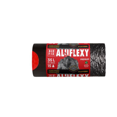 A Szemeteszsák, zárószalagos, 35 l, 15 db, ALUFIX Aluflexy (KHK964) Egyedi, rugalmas 2 rétegű szemeteszsák. Húzózáras típus a könnyű zárás,kezelés és szállítás érdekében. Extra terhelési kapacitás. Különleges gyémántformájú anyagtextúra erősített nyújth