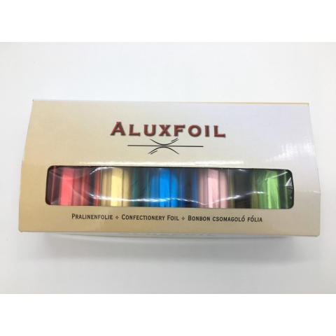 Aluxfoil bonbon csomagoló alumínium fólia, 5 szín, 5x10 m - Színes édesipari alumínium csomagolófólia bonbonok, csokoládék, szaloncukor csomagolására- Egyik oldalon festett, másik oldalon sima ezüst- OÉTI által élelmiszeripari csomagolásra bevizsgáltAz Al