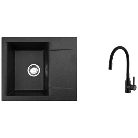 Mosogatótálca és csaptelep szett - MOSOGATÓTÁLCA: téglalap alakú, egymedencés, medencével, csepegtetővel, anyaga: gránit, szűrős lefolyó, mosogatógép lefolyóval, fekete színű, a konstrukció teljes mérete: 59 cm × 50 cm × 18 cm (Ho×Szé×Mé), a medence mérete: 31,5 × 42 × 18 cm (Ho×Szé×Mé), CSAPTELEP: mosogató, anyaga: gránit, tartozék: leeresztőszelep, rögzítő furat átmérője: 35 mm, fekete színű A(z) Alveus GEM 20 91 + Mintas black MAT csaptelep mosoga