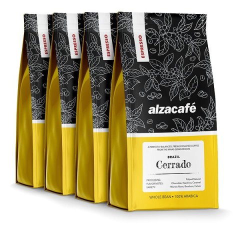 Kávé - szemes, válogatott, 100% Arabica, fajta: Mundo Novo, Bourbon és Catuai, származási hely Brazília, tengerszint feletti magasság 750 - 1100 m, pörkölési hely Csehország, közepes pörkölési fok, alacsony savtartalom, ízprofil: csokoládé, mogyoró és karamell, eszpresszóhoz alkalmas, tömege 4×250 g Select brandAlzaPowerAlzaErgoAlzaGuardBlackmontEternicoFerridaLa ProromanceAlzaCaféVálogatott kávé a brazíliai szavannárólAz AlzaCafé Brazil Cerrado a Mundo Novo, Bour