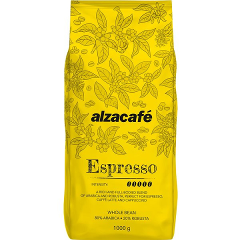 Kávé - szemes, 80% Arabica és 20% Robusta, pörkölés helye Németország, közepes pörkölési fok, intenzitás 5/5, ízprofil: sűrű krém és enyhén diós felhang, eszpresszóhoz és tejes változatokhoz alkalmas, tömeg 1000 g Arabica és Robusta gazdag és teljes keverékeKényeztesd magad az exkluzív AlzaCafé Espresso kávészemek intenzív ízével és gazdag aromájával – 80% Arabica és 20% Robusta keverékével, amely ideális egy i