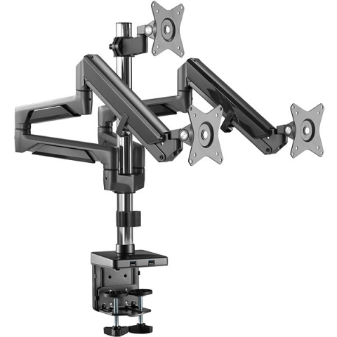 Monitorállvány - asztali, kábelkivezetőhöz, 17 - 27" méretű monitorokhoz, terhelhetősége 21 kg, dőlésszög +/- 40°, forgatási szög 180°, forgás 360°, VESA felfüggesztés 100×100 és 75×75 mm, forgatható, dönthető és gázrugós, fekete kivitel Robusztus tartó három monitorhoz praktikus USB elosztóvalAz AlzaErgo Arm D130B Premium USB elegáns térfekete kivitelben nem hiányozhat az íróasztalról, különösen, ha fontos számodra munkahelyed átláth