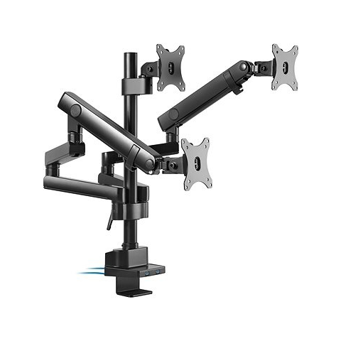 Monitorállvány - asztali, kábelkivezetőhöz, 17 - 27" méretű monitorokhoz, terhelhetősége 21 kg, dőlésszög +/- 90°, forgatási szög 180°, forgás 180°, VESA felfüggesztés 100×100 és 75×75 mm, forgatható, dönthető és rugós, fekete kivitel Élvezd a maximális kényelmet a munkahelyedenAz AlzaErgo Arm T10B Essential USB tartó lehetővé teszi három akár 27"-es monitor felszerelését, VESA gyorsan kioldható adapterekkel. A gyors és könnyű