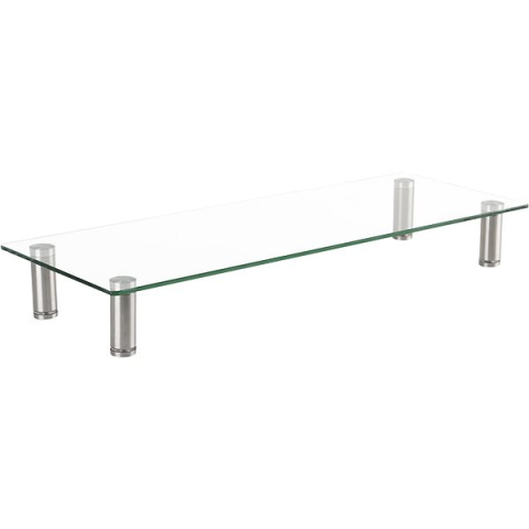 Monitor emelvény - méretek 58 x 21 x 9 cm, teherbírása 20 kg, ajánlott képernyőméret 13-32", rozsdamentes acél és edzett üveg kombinációja Stílusos állvány, amely növeli a számítógép kényelmét Az AlzaErgo Riser ER150GS monitor alatti állványunkkal a számítógépen végzett munka kényelmesebb és egészségesebb lesz - a kép