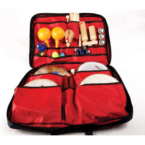 Nagy ütõs készlet. A táska tartalma: mûanyag maracas, mûanyag kastanyetta, csengettyû, 4 nagy csengettyû, tripla sambino, fa nyelû kastanyetta, tamburine 17, 18 és 21 cm, nagy réz triangulum 15 c...