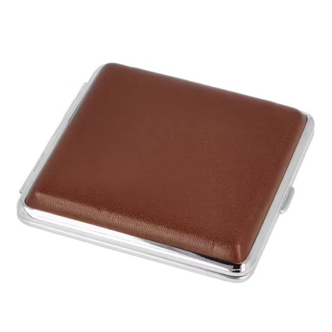 Barna színű műbőr cigaretta tárca 10 db cigaretta tárolására. A belsejében található gumiszalagok segítenek rendben tartani a cigarettákat a tokban. Gombnyomásra nyílik. A cigaretta tárca belső zsebbe is könnyedén elfér, így bárhova