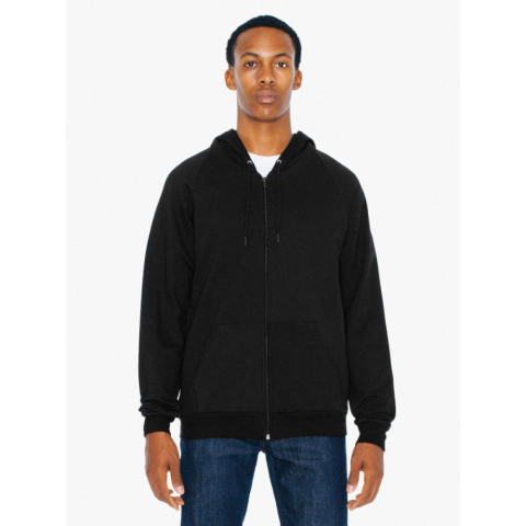 American Apparel vékony unisex cipzáras kapucnis pulóver, 244 g/m2 100% Fésült Pamut Kapucnis, színazonos húzózsinórral Színazonos zipzár 1x1 Rib kötésű karkivágás és derékrész Raglán ujjú Kenguru zseb Szatén címke Oldalvarrott XS S M L