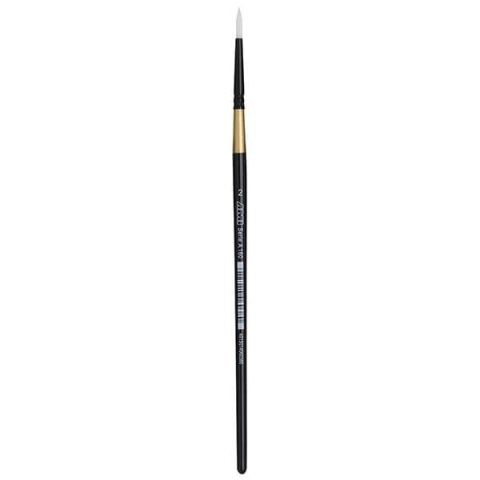 Kerek ecset, erős és rugalmas szintetikus, fehér színű szőrrel.