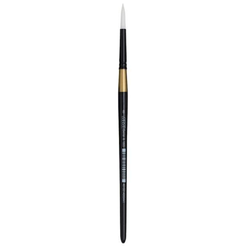 Kerek ecset, erős és rugalmas szintetikus, fehér színű szőrrel.