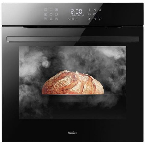 Beépíthető sütő - mérete 59,5 × 59,5 × 57 cm (M×Sz×Mé), gőzsütési funkció, űrtartalma 77 l, a felszereltség része gyors előmelegítés funkció, grill, felső, alsó sütés, körkörös fűtőelem, hőlégbefúvás, kiolvasztás funkció, légkeverés, tepsi mérete 56 × 56 cm (Sz×Mé), teleszkópos tepsi kitolás, érintéses vezérlés, tompított ajtózárás és 3 rétegű üveg, hűtőrendszer, 3600 W teljesítmény, kijelző és belső világítás, 2 tepsi és 1 rác