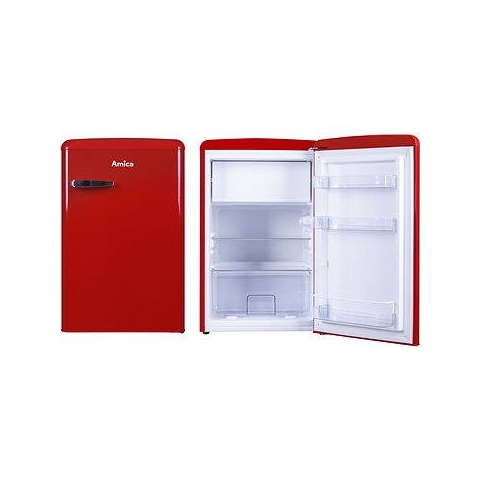 Kis hűtő - kombinált (fagyasztós), energiaosztály E, klímaosztály ST, hűtőtér tárolókapacitása 95 l, fagyasztótér tárolókapacitása 13 l, jobb oldali zsanéros, 2 polc, 1 fagyasztórekesz, 1 hűtőkör, retro design, piros kivitel, LED világítás, méretek 86 × 55 × 62 cm (Ma×Sz×Mé) Az Amica VT 862 AR hűtőszekrényt retro dizájn és kompakt méretek jellemzik. Belül egy hűtő és egy fagyasztó részleg található. A hűtőszekrény automatikus leolvasztási funkci